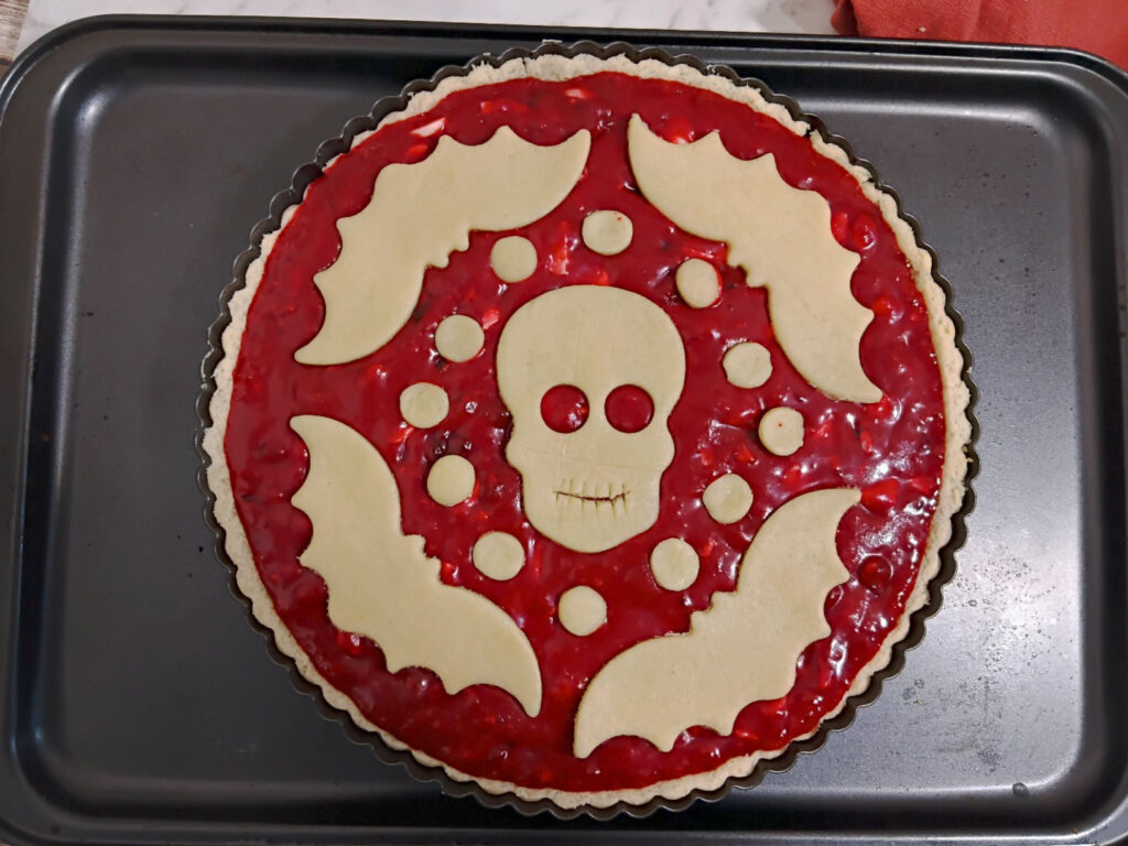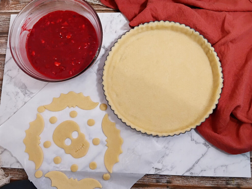 A red velvet tart with a spooky twist. Strawberries and white chocolate become the guts and bones of this pie. While the cream cheese pastry is the base and the decoration.