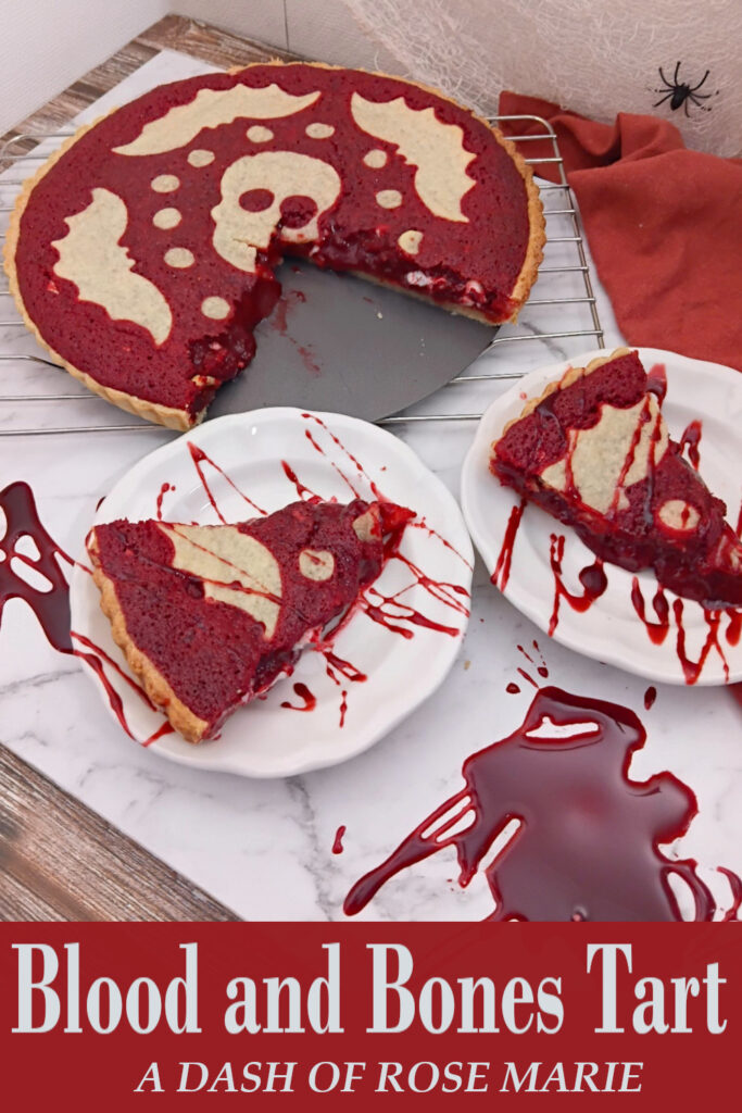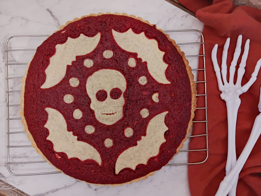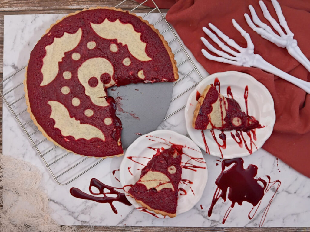 A cream cheese pastry, filled with a red velvet, white chocolate and strawberry filling. This blood and bones – red velvet tart is the perfect spooky treat this Halloween.