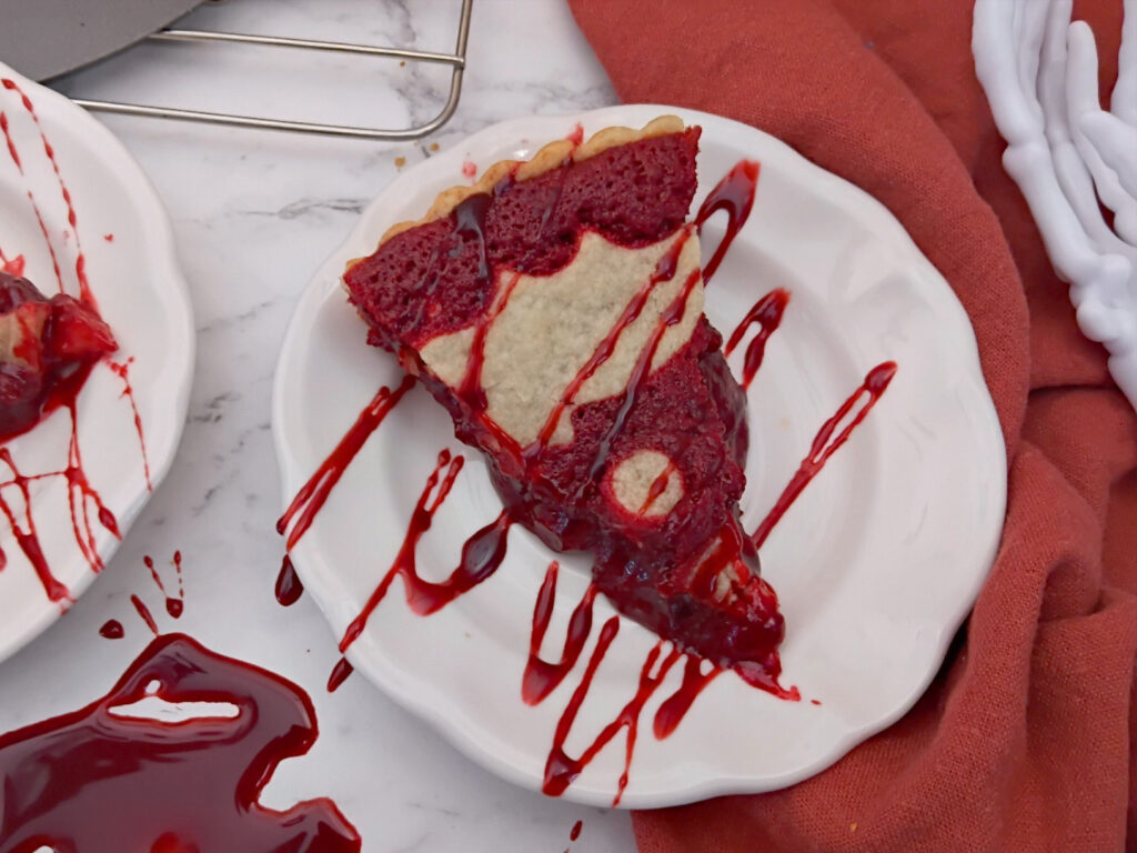 I definitely recommend serving this up as an extra special dessert over Halloween. Place a generous slice of this pie on a plate, add some homemade vanilla ice cream and drizzle over a whole lot of edible fake blood to boost that gross factor.