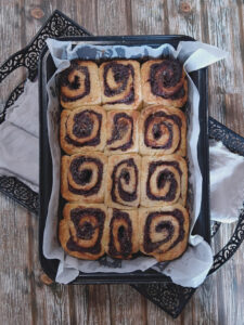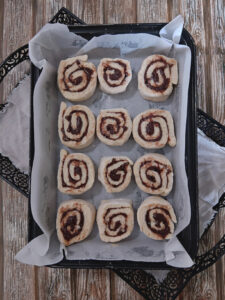 Chocolate filling – The base of your chocolate filling is hazelnut spread. Not only does it have a great taste but it is smooth and spreadable. To this we add butter sugar and cocoa. Melt it all together and spread it over your rolled out dough for a rich, decadent chocolate filling. All that’s left to do now is sprinkle over some chocolate chips and roll up your scrolls. Slice and you are ready to bake.