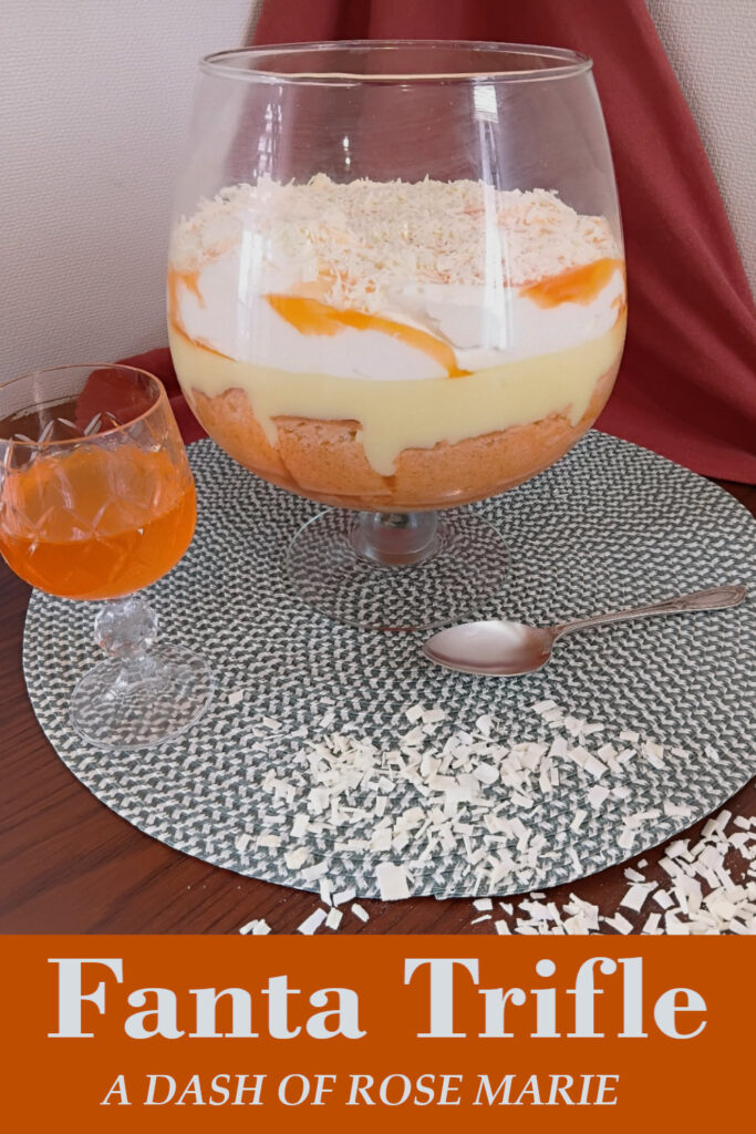 In this trifle you will find layers of sponge cake, Fanta jelly and white chocolate custard that are topped off with whipped cream, Fanta syrup and grated white chocolate. Traditional style layers but with a fun twist.