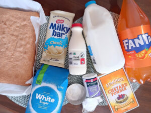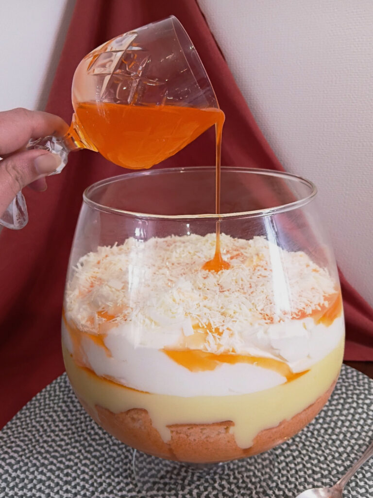 Fanta jelly – A jelly that is made from Fanta will be poured over your sponge cake and left to absorb and set. If you prefer your trifle layers to be fully separate you can absolutely set your jelly first, chop it into pieces and layer over your sponge instead.