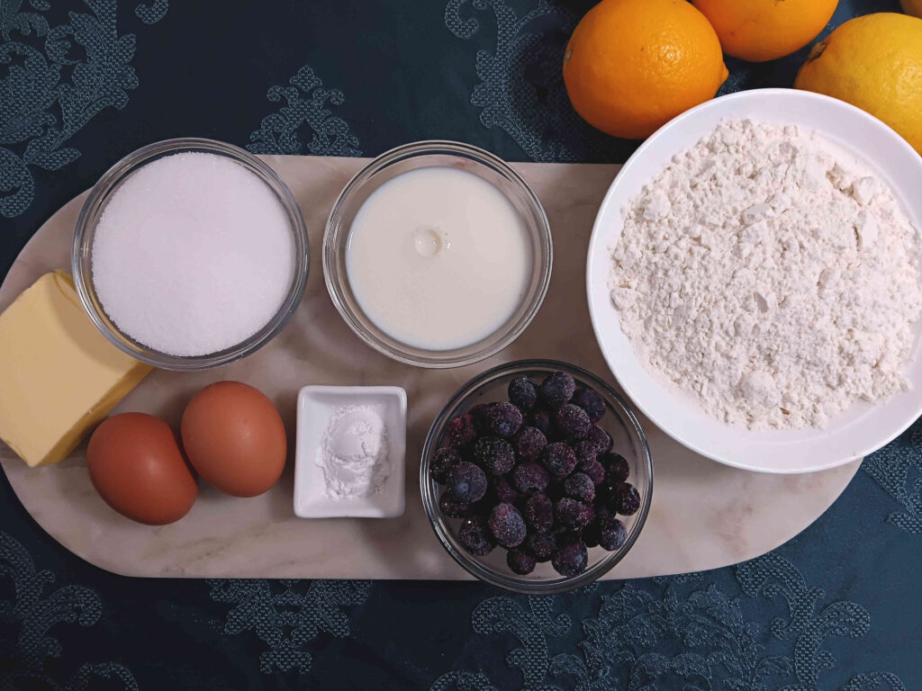 Frozen blueberries, lemon zest and juice, eggs, milk, sugar, flour and baking powder is all you will need to make these for yourself.