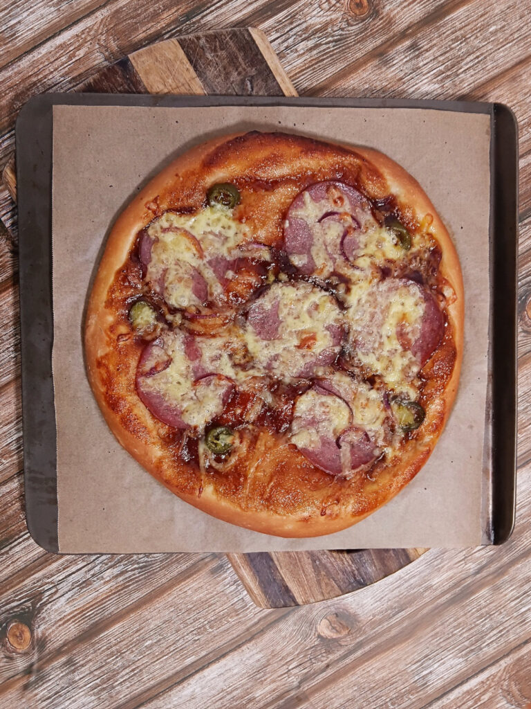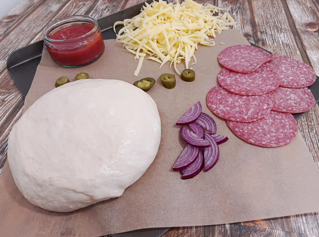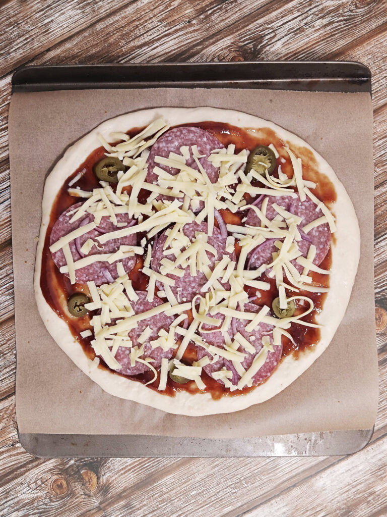 - Roll out your dough to your desired thickness and cover with toppings and bake.
