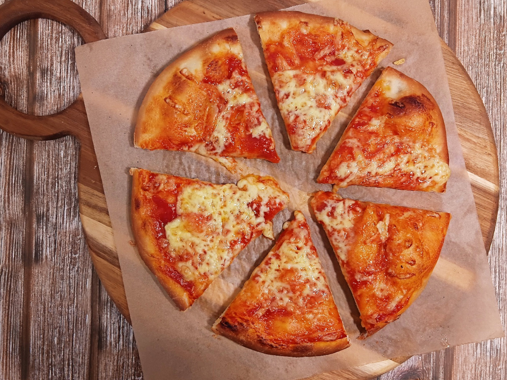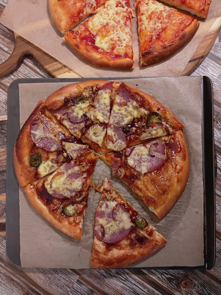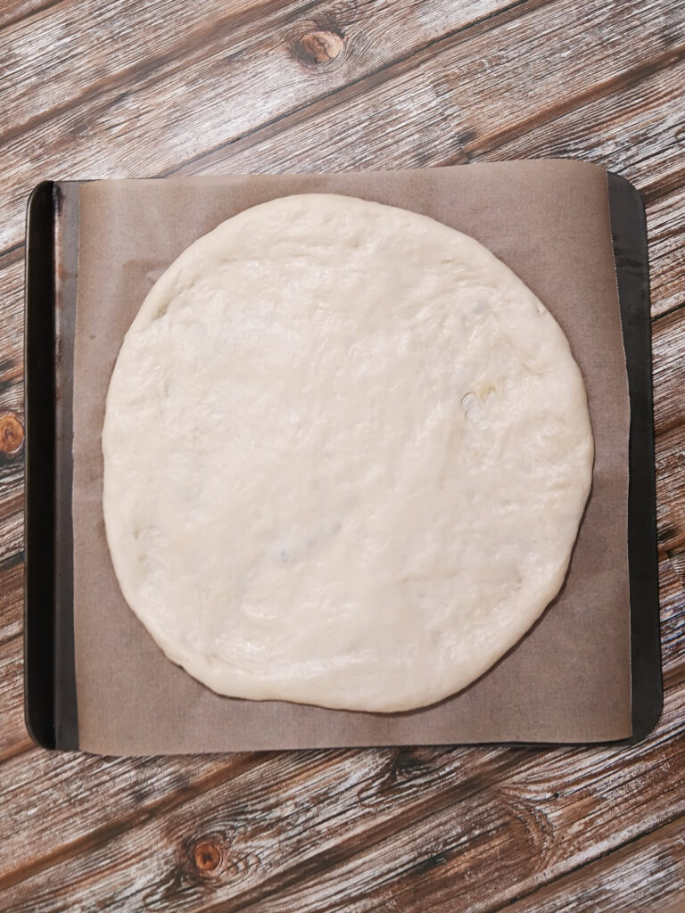 Follow this recipe up to the point of rolling out the dough to form your pizza base. Before you roll out your dough, preheat your oven to 200 degrees celcius with your baking tray in the oven. Roll out or stretch your dough to your desired shape and size. Transfer your rolled dough onto a large piece of baking paper before adding your toppings. Bake your pizza for 15 minutes or until the pizza dough is crispy and baked through.