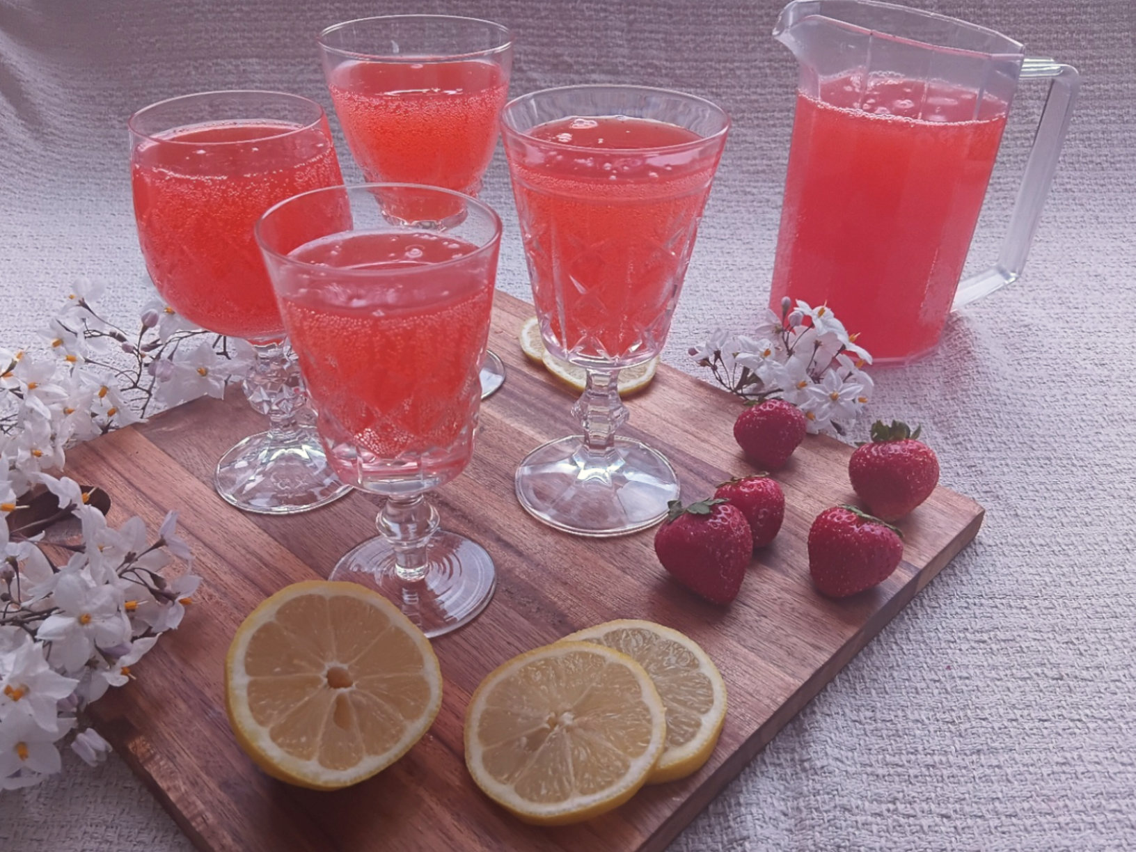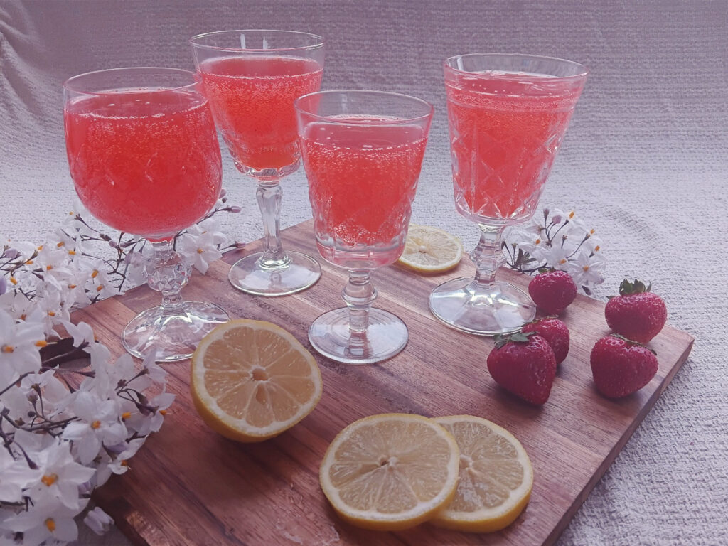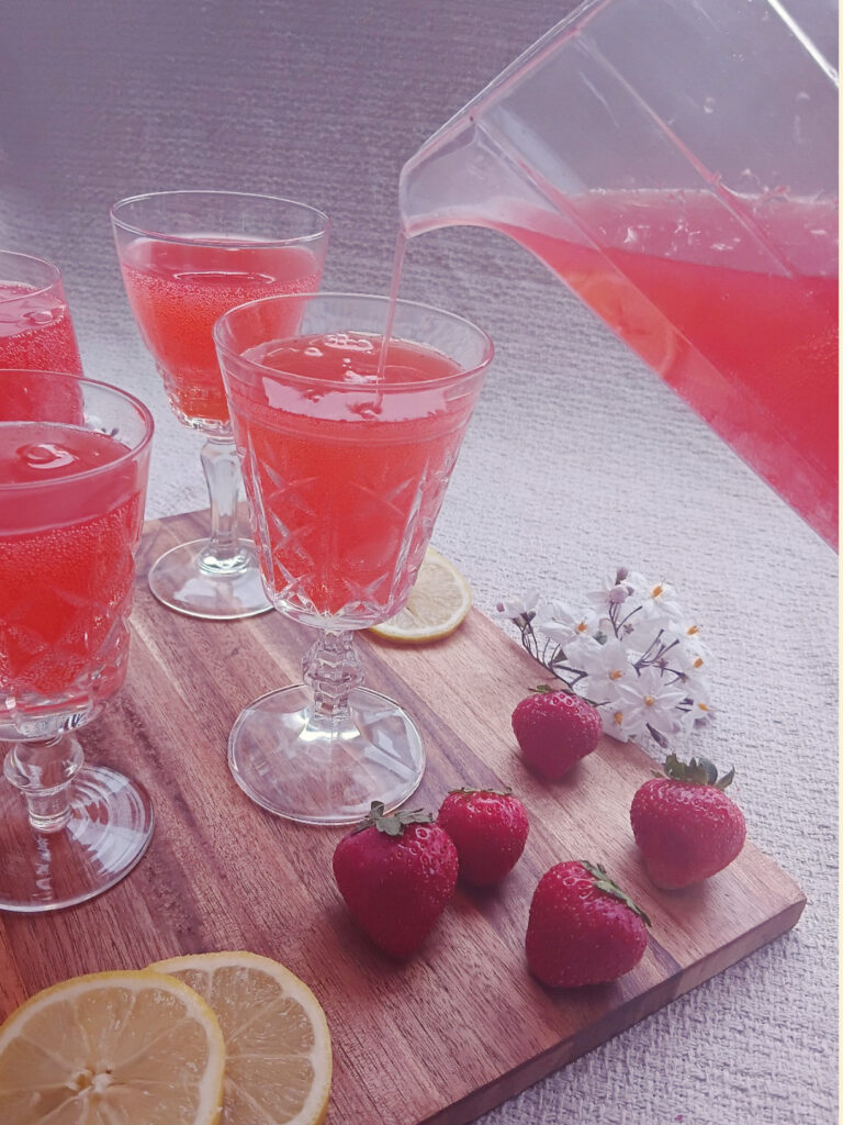 For my pink lemonade I use strawberries. I really like to ensure that the flavour of the lemon and the “pink” addition both shine.