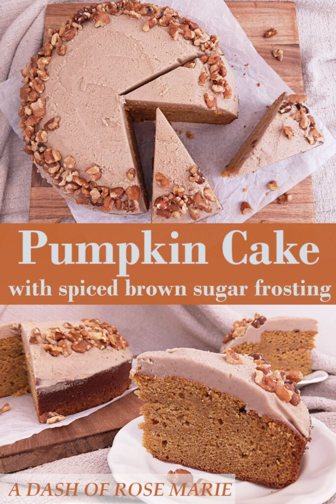 Not only is this pumpkin cake moist, soft and loaded with pumpkin spices, but it looks absolutely beautiful, decorated with a spiced brown sugar frosting.