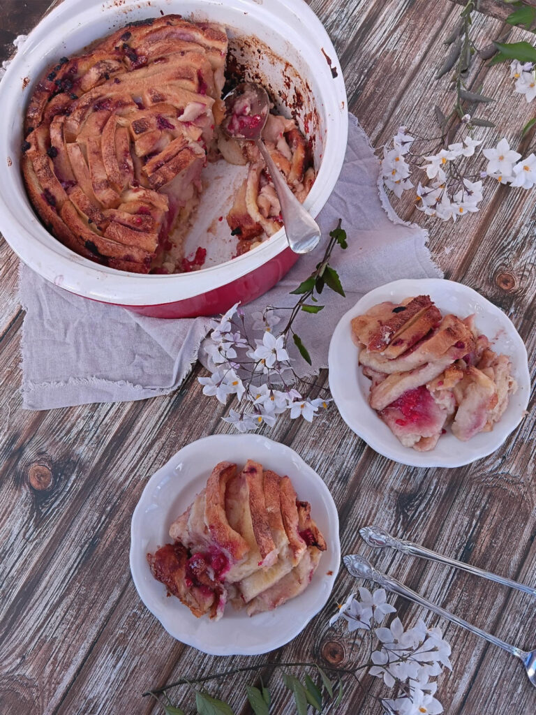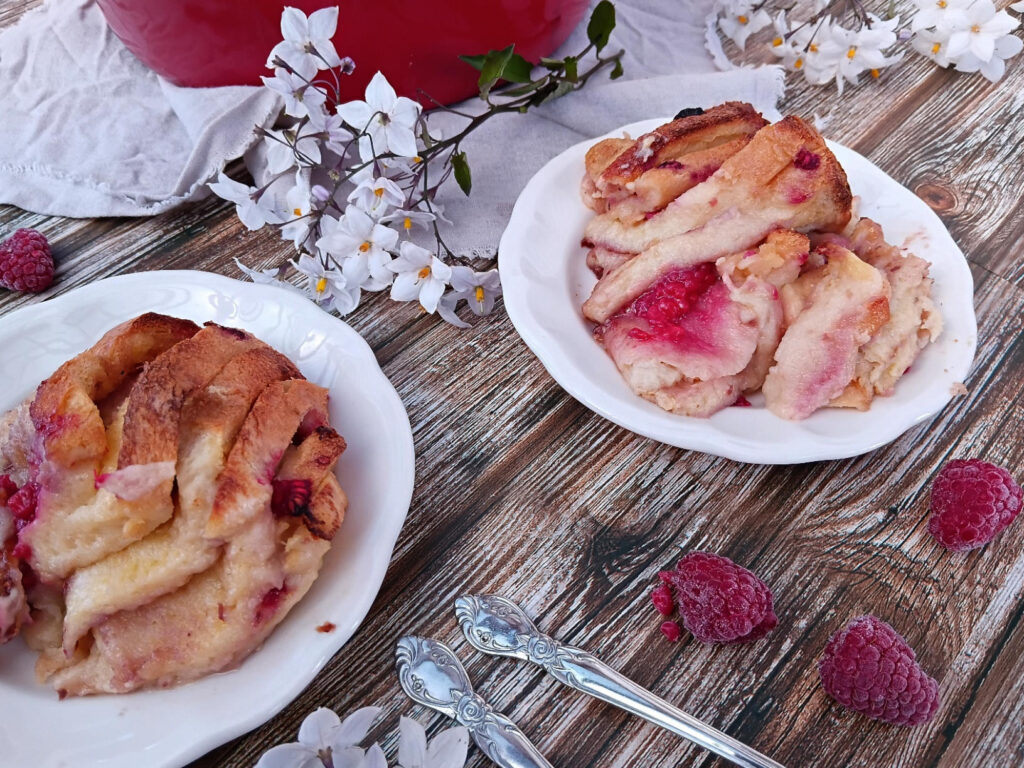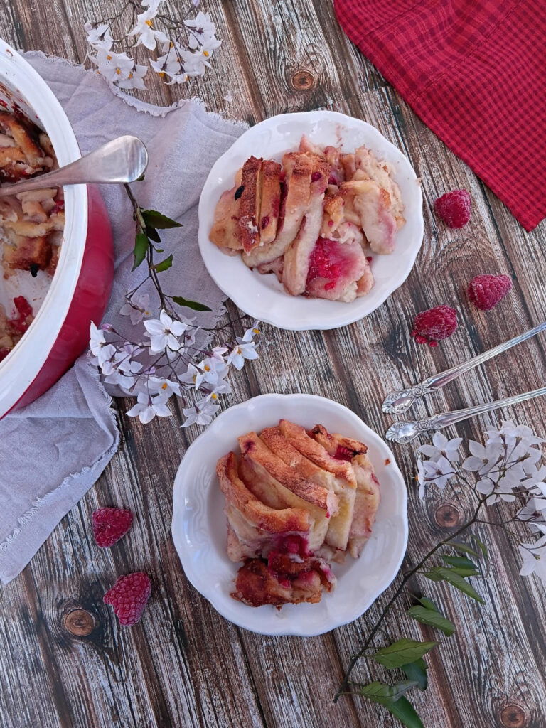 If you like french toast, then you will love this raspberry bread and butter pudding. It is like oven baked french toast with a crispy top, soft buttery layers of custard soaked bread with bursts of bright and delicious raspberries.