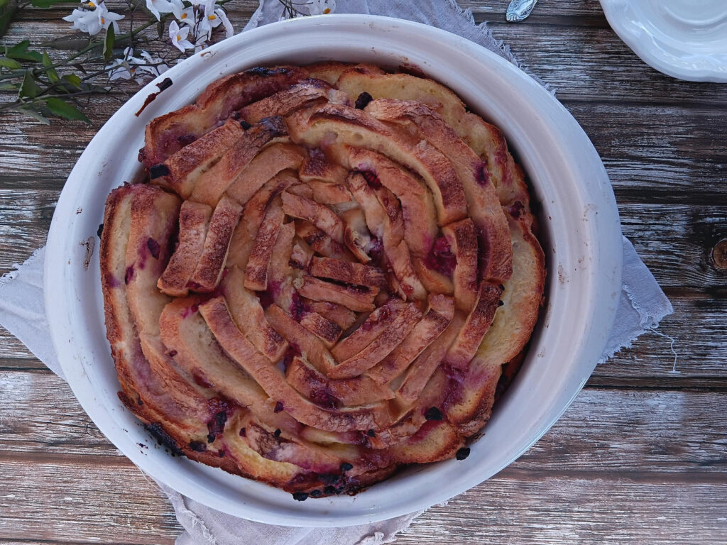 And to achieve this all you have to do is spiral the bread slices around a round baking dish instead of laying them flat in a shallow baking dish. Placing the crusts at the top of the pudding really reinforces that rose style pattern that is naturally achieved. This also has the bonus of providing little pockets of space where you can load your bread and butter pudding up with extra raspberries or even some sneaky chunks of white chocolate for an extra treat.