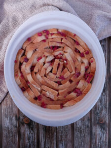 - Place your first half slice into a large round baking dish with the buttered side against the dish and the crust at the top. Place more slices in the same way around your dish. Once your outer edge is covered in bread slices, place your next layer, starting at the end of your last piece. Continue placing your bread slices around your dish in a spiral pattern until you have a loose spiral of bread that reaches the center.
