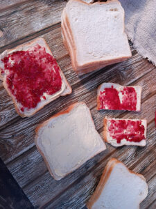 - Prepare your bread by generously spreading butter and then jam on each slice of bread.