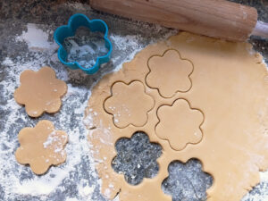 - Dust your bench top, rolling pin and dough with a bit of icing sugar. Roll your dough out to approx 1 cm thick. Cut out cookies using your chosen cookie cutters and place them onto a lined baking sheet. Gather up the scrap dough and roll it out again as needed until all of the dough has been cut into cookies.