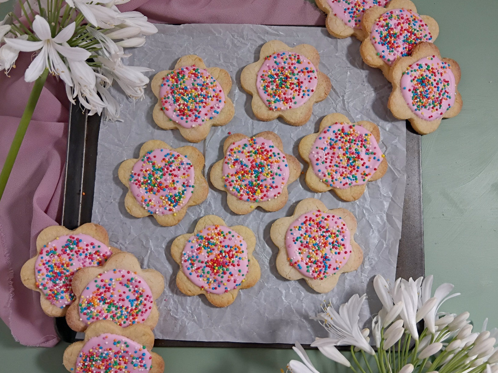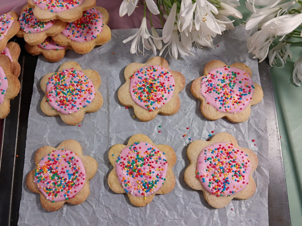 - Dollop a teaspoon into the centre of your cookie spread it around evenly to make a large circle in the centre of your cookie. Add sprinkles on top of the wet icing. Repeat with the remaining cookies until all of your sugar cookies are decorated.