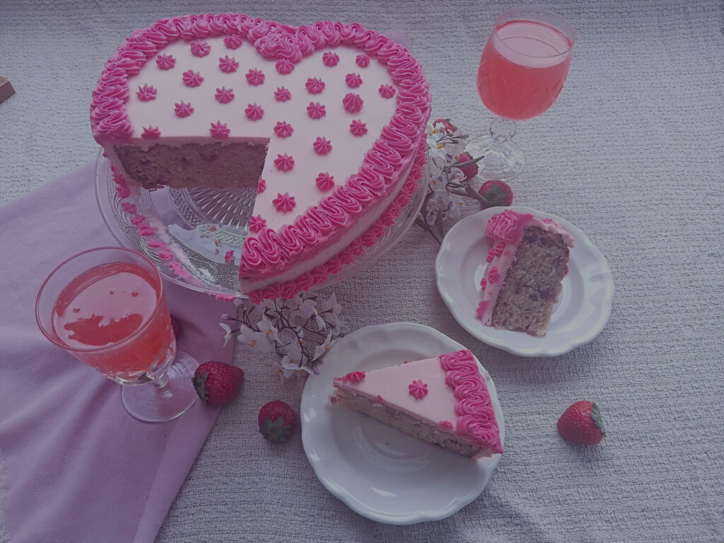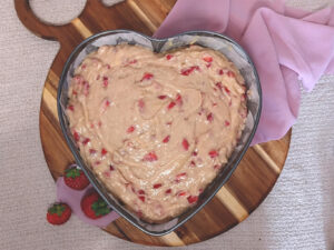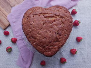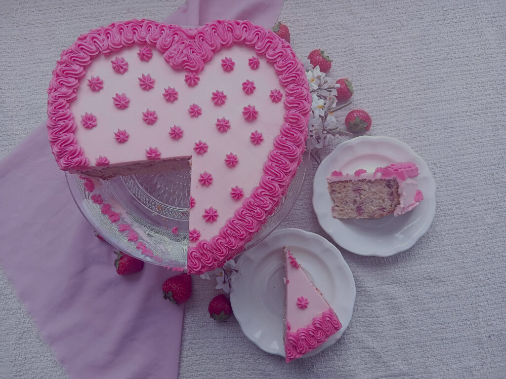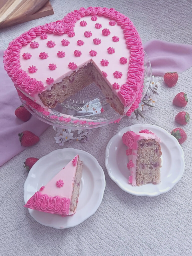 Fresh strawberries shine in this delightful heart shaped strawberry cake. This is a simple, moist vanilla cake that is speckled with beautiful bursts of pink strawberries.