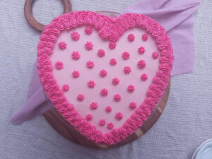 -For a sweet heart style cake baked your cake in a heart shape like I have here.Decorate with a simple pink vanilla buttercream.